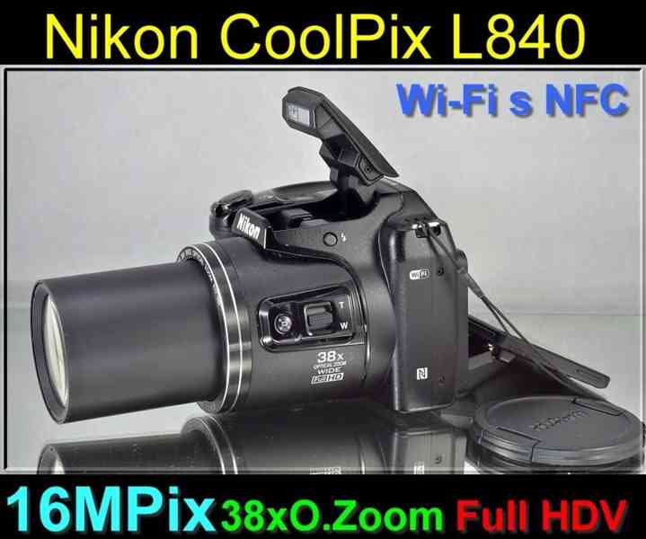 Nikon Coolpix L840 je kompaktní ultrazoom s rozlišením 16 MPix a optickým zoomem 38x. Má velký výklopný displej a mechanickou redukci vibrací. Je vybaven Wi-Fi s NFC. Natáčí FullHD video.