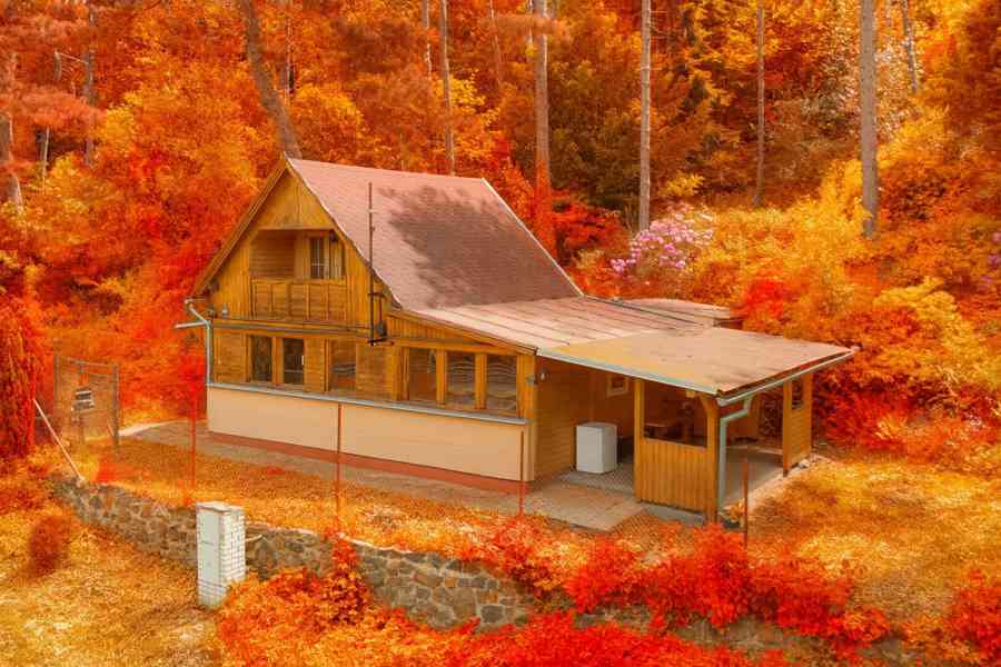 Za chatou se rozprostírá les jako z pohádky, a pod jeho ochranou najdete velkorysou pergolu, ideální pro venkovní kuchyni, grilování i tichá rána s kávou a knihou.