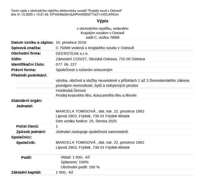 V rámci insolvenčního řízení se nabízí k prodeji Obchodní podíl ve výši 100 % s vkladem 1.000,- Kč (splaceno 100 %) v obchodní společnosti DEERSTEAK s.r.o. IČ: 07706227, se sídlem Zámostí 1155/27, 710 00 Ostrava, č. majet. podstaty 2.