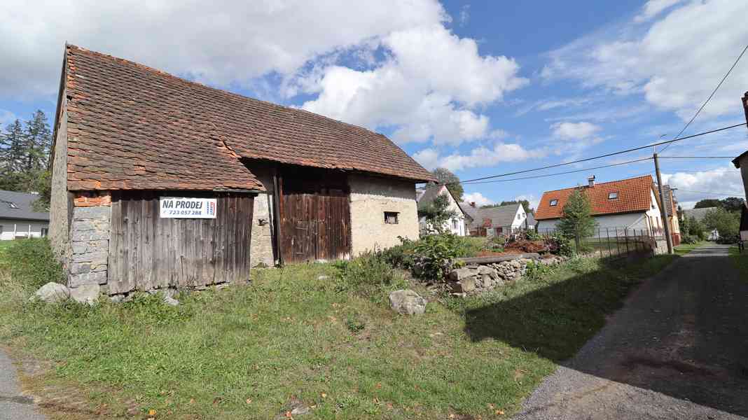 Pozemek o celkové ploše 439 m2 se stodolou o zastavěné ploše 120 m2 je ze dvou stran oplocen, zaopatřen přístupem po asfaltové cestě, kterou využívají převážně jen vlastníci sousedních domů.